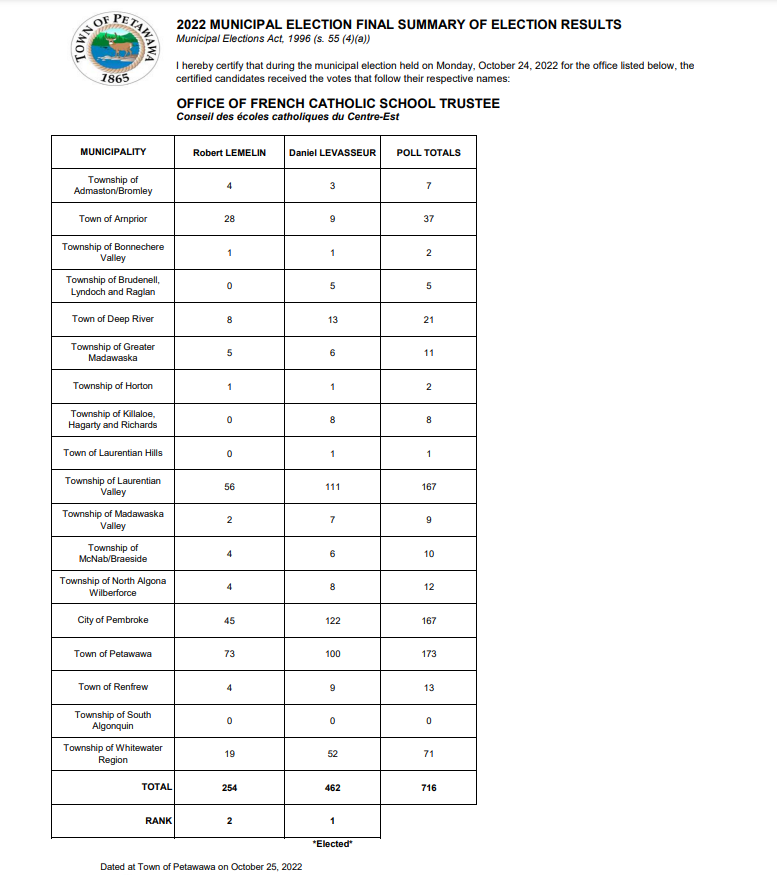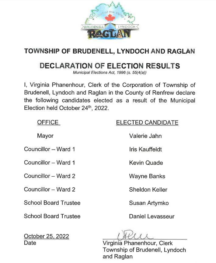 Nomination Forms can be filed at the township office from May 2, 2022 to August 18, 2022 (9:00 am to 4:00 pm), and on Nomination Day (August 19, 2022) from 9:00 am to 2:00 pm. on the prescribed form and accompanied by acceptable identification, and the prescribed nomination filing fee of $200 for the Head of Council and $100 for all other offices.