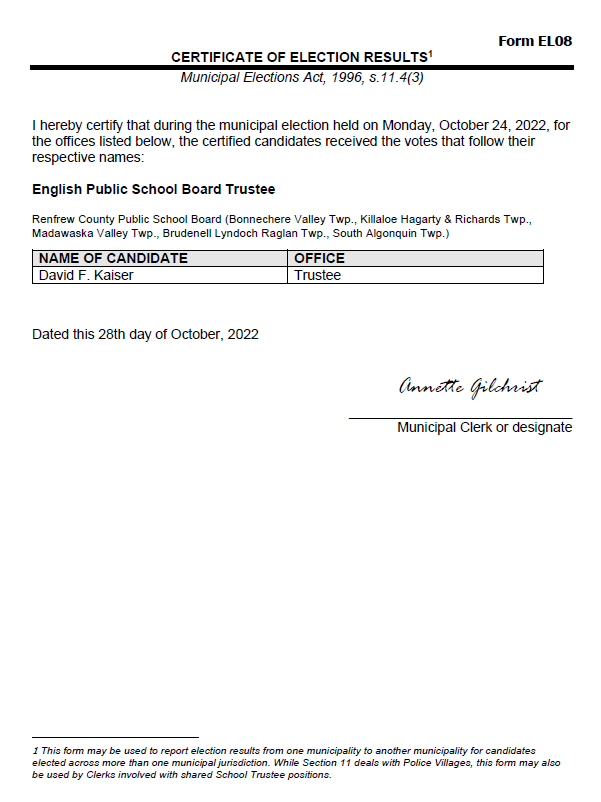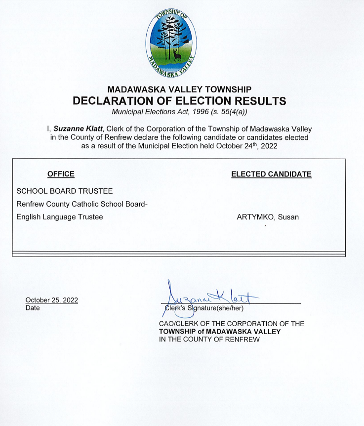 The filing fee is payable by cash, debit, cheque, certified cheque, e-transfer, bank draft or money order. A nomination must be signed by the candidate.