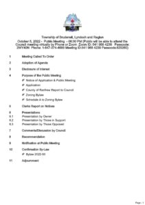 Agenda | Public Council Meeting – October 5, 2022 View or download this Document Document Date: 2022-10-05 Agenda | Regular Council Meeting – October 5, 2022 Minutes | Special Council Meeting – September 7, 2022
