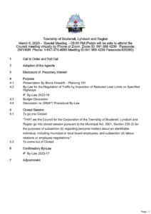 Agenda | Special Council Meeting – March 6, 2023 View or download this Document Document Date: 2023-03-03 Minutes | Special Council Meeting – February 22, 2023 Reduced Load Limits – 2023