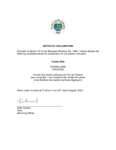 Declaration of Acclamation to Office for the French School Board Trustee View or download this Document Document Date: 2022-08-22 This Document appears on the following Articles: Official List of Candidates, Declaration of Acclamation to Office for the English Public School Board Trustee 2022 Third Party Advertisers’ Guide