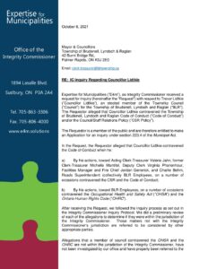IC Report BLR – Councillor Lidtkie – October 6 2021 View or download this Document Document Date: 2021-10-06 This Document appears on the following Articles: Integrity Commissioner Investigations, IC Report BLR – Councillor Budarick – October 6 2021 IC Report BLR – Councillor Lidtkie MCIA – October 6 2021