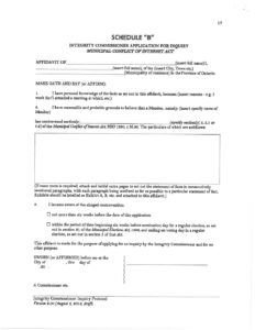 Schedule B – Integrity Commissioner Application for Inquiry – Municipal Conflict of Interest Act View or download this Document Document Date: 2018-08-06 This Document appears on the following Articles: File a Complaint, Schedule A – Integrity Commissioner Request for Inquiry – Code of Conduct Civic Address Request Form